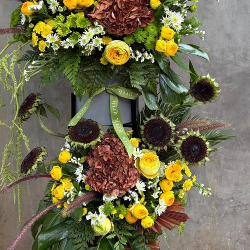 Double Decked is a striking vase arrangement designed in two distinct layers. Bright sunflowers and yellow roses bring warmth and radiance to the arrangement, while sprayed rust hydrangeas add depth and character. Accents of yellow chrysanthemums, purple majesty, white statice, and cascading green amaranth create movement and texture throughout. Playful yet thoughtfully structured,this arrangement that reveals something beautiful from every angle.