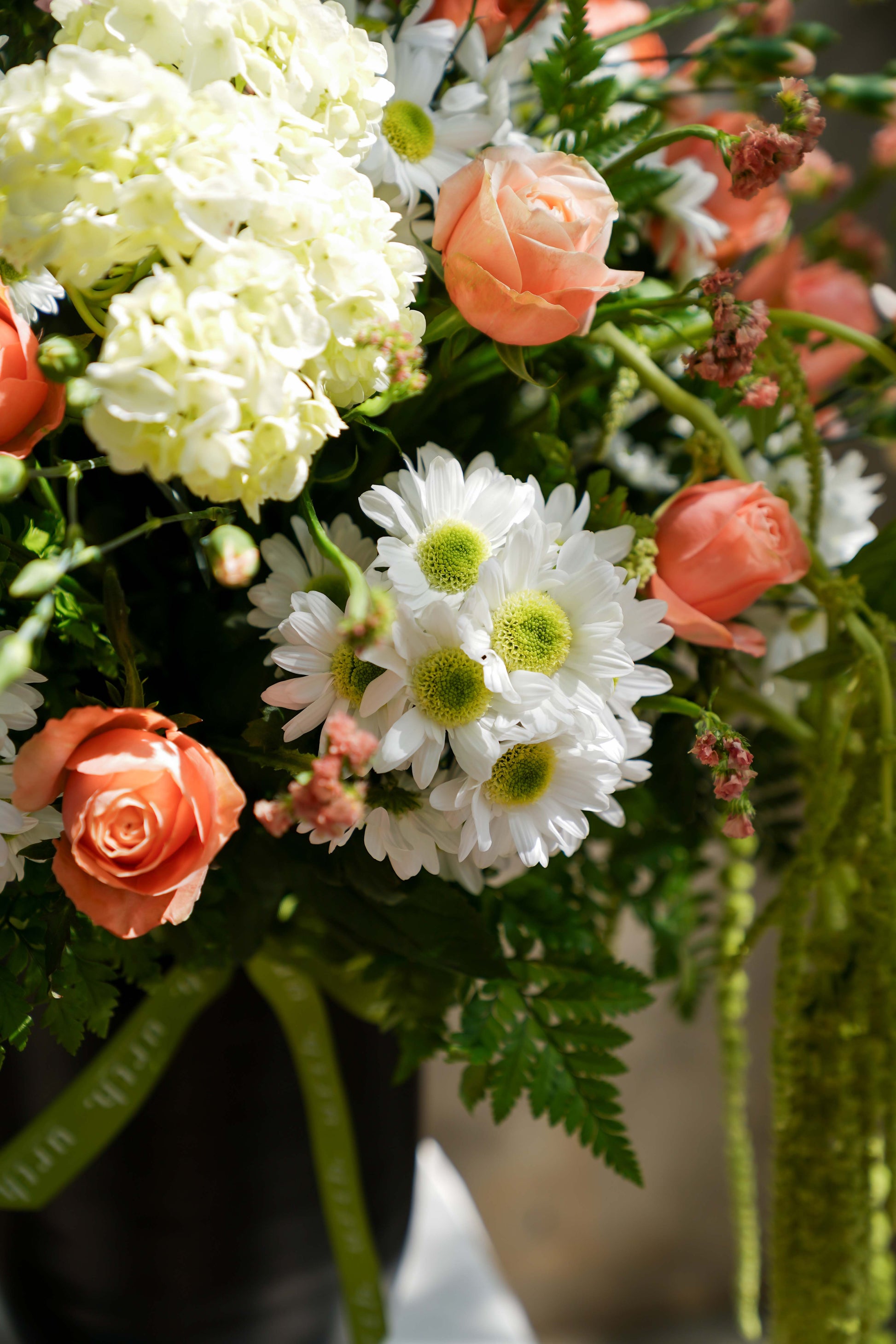 Flowers Used: Allium, Green Amaranth, White Hydrangeas, Kahala Rose, White Chrysanthemum, Kamini, Peach Spray Carnation, Statice